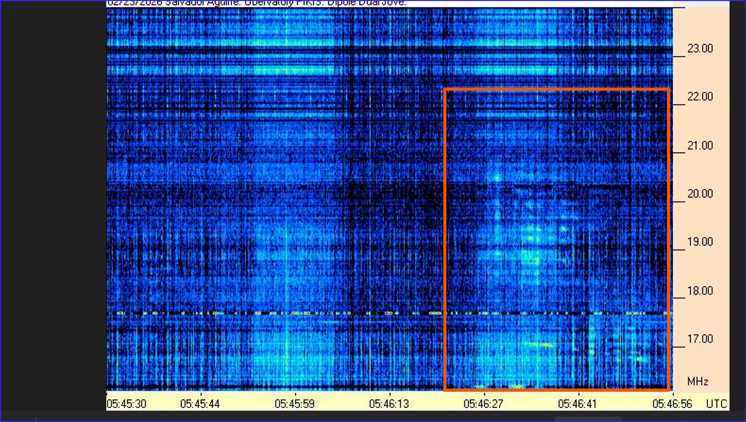 El dia 231 de Febrero 2026 UT pude capturar unas rafagas de radio de Júpiter en un evento Io A( relacionado con la Luna Io de Júpiter). lo anterior fue captado con mi antena Radio Jove Dual , el receptor RSP1A y software RSS (Radio Sky Spectrograph) .